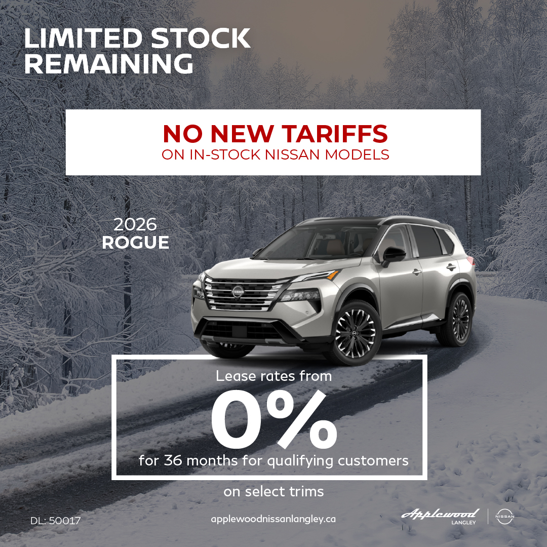 Offers available from December 2, 2025 to January 2, 2026. *Representative finance offer based on a new 2025 Rogue S AWD. Selling Price is $ 36,867 financed at 0 % APR equals 48 monthly payments of $ 768 monthly for a 48 month term. $ 0 down payment required. Cost of borrowing is $ 0 for a total obligation of $ 36,867. Financing Bonus of $ 0 is available on advertised offers for 2025 Rogue S AWD.License, registration, insurance and applicable taxes are extra. Offers are available on approved credit through Nissan Canada Finance for a limited time, May change without notice. Retailers are free to set individual prices. Vehicles and accessories are for illustration purposes only.