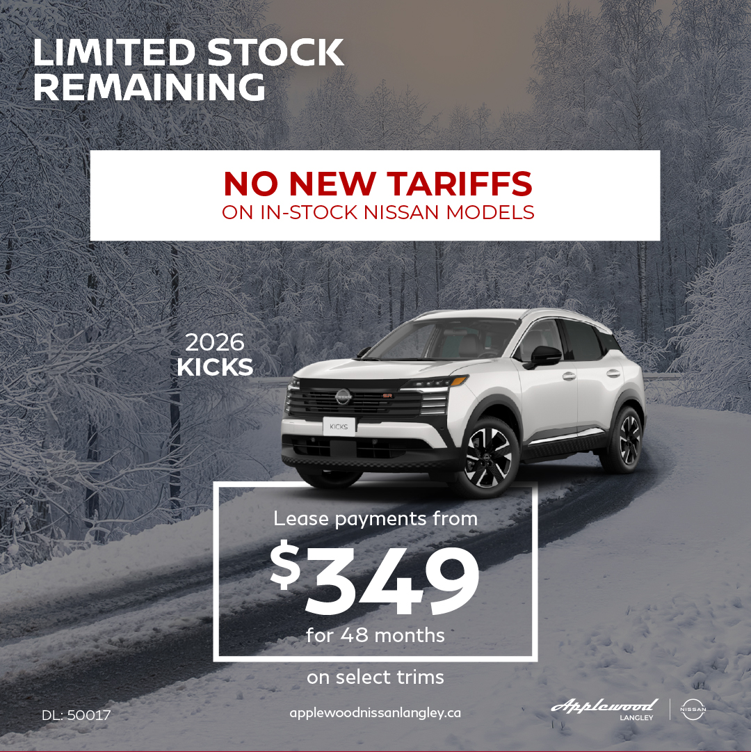 Offers available from December 2, 2025 to January 2, 2026. Payments cannot be made on a weekly basis, for advertising purposes only.*Representative monthly lease offer based on a new 2025 KICKS S at 3.99% APR for 48 months equals monthly payments of $ 347 with $ 3095 down payment, and $0 security deposit. Lease based on a maximum of 16,000 km/year with excess charged at $0.10/km. Total lease obligation is $ 19,833. Lease Bonus of $ 0 is included in the advertised offer.License, registration, insurance and applicable taxes are extra. Offers are available on approved credit through Nissan Canada Finance for a limited time, May change without notice. Retailers are free to set individual prices. Vehicles and accessories are for illustration purposes only.