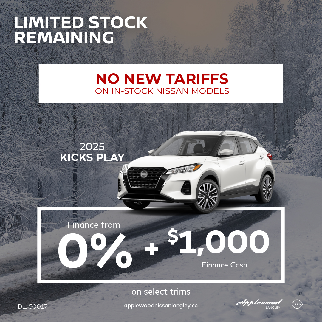 0.5% Loyalty Rate Reduction applies to new and previously unregistered 2025 KICKS PLAY models that are purchased or leased/financed (on approved credit) from an authorized Nissan dealer in Canada between December 2, 2025, and January 2, 2026. Offer subject to change or cancellation without notice.License, registration, insurance and applicable taxes are extra. Offers are available on approved credit through Nissan Canada Finance for a limited time, May change without notice. Retailers are free to set individual prices. Vehicles and accessories are for illustration purposes only.