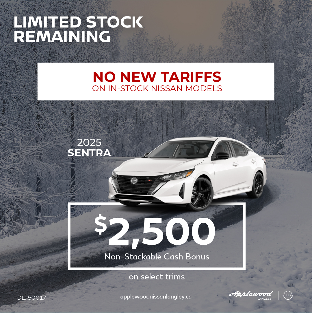 Offers available from December 2, 2025 to January 2, 2026. Payments cannot be made on a weekly basis, for advertising purposes only.*Representative monthly lease offer based on a new 2025 Sentra S Plus at 3.49% APR for 48 months equals monthly payments of $ 297 with $ 3295 down payment, and $0 security deposit. Lease based on a maximum of 16,000 km/year with excess charged at $0.10/km. Total lease obligation is $ 17,617. Lease Bonus of $ 0 is included in the advertised offer.License, registration, insurance and applicable taxes are extra. Offers are available on approved credit through Nissan Canada Finance for a limited time, May change without notice. Retailers are free to set individual prices. Vehicles and accessories are for illustration purposes only.